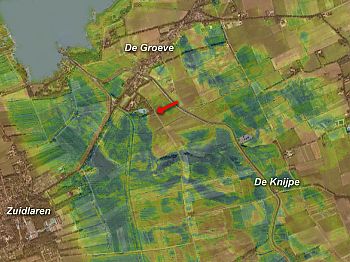 Tussen ‘De Dijk’ (de weg die c. 100 meter ten oosten van het ‘bebouwde-kom-bord’ van De Groeve’ vanaf de Hunzeweg naar het zuiden aftakt) en de Hondsrug is de ondergrond van het veen niet echt vlak. Op de foto komt het helaas niet zo duidelijk uit, maar zo’n 50 meter ten westen van De Dijk daalt het maaiveld over een korte afstand van 1,92 naar 0,19 m +NAP. Daar moet ooit de Hunze hebben gelopen.