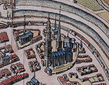 Het imposante ‘kerkfort’ op de voorgrond is de door bisschop Burchard gebouwde Sint Walburg. Daarachter staat de oudere Sint Maartenskerk: een eenvoudig tufstenen gebouw dat kort na het jaar 900 is opgetrokken ter vervanging van de eerste (houten) Sint Maarten.