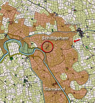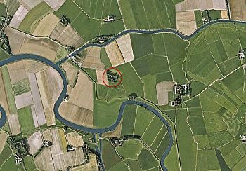 Op dit plaatje zijn de locatie van de voormalige boerderij Maarhuizen (in de rode cirkel) en het ‘Notarisbosje’ (het vlekje ten zuidoosten van de boerderij) herkenbaar. Het ‘Notarisbosje’ staat op de plek waar de ‘Schillighamsterzijl’ heeft gelegen.