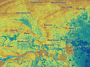 Wanneer we uitzoomen tekent de noordwaarts gerichte Hunzemonding zich duidelijk op de hoogtekaart af. Ook de verschillende kwelder- en oeverwallen zijn goed zichtbaar.