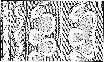 Het linker plaatje laat van links naar rechts de natuurlijke ontwikkeling zien van een door een vlak land stromende rivier. Het is een vereenvoudigd model, want in de werkelijkheid kan een meanderende rivier een ingewikkeld netwerk van kronkels vormen. Afhankelijk van de aard van de ondergrond kan er zelfs een soort vlechtwerk ontstaan. Wanneer daarbij ook nog eb en vloed komen, kan zich een breed moerassig gebied vormen waarin de beddingen alleen bij laag water zichtbaar zijn.