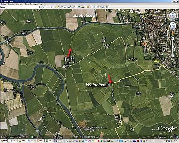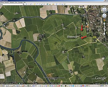 De pijlen geven de kijkrichting aan van de twee volgende foto’s De bovenste pijl wijst naar de zijltocht die het water van de Deel naar de Winsumer- of Oldenzijl bracht, de onderste naar de plaats van de zijl.