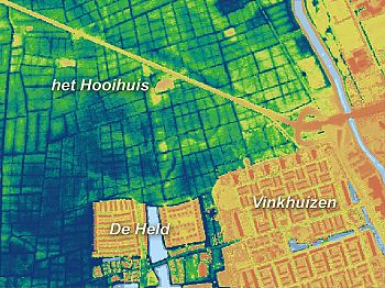 Op Google zijn wel de sloten zichtbaar, maar niet dat ze in een bredere laagte liggen. Wat dat betreft biedt combinatie met de hoogtekaart meer duidelijkheid. De volgende afbeelding laat dat zien.