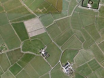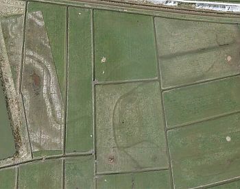 In het veld achter de huizen aan de Peizerweg en de Wolvedijk bevinden zich minuscule kronkeltjes, die op het Google-beeld (links) niet zo goed zichtbaar zijn, maar voor de dag komen bij een schuine belichting (rechts).