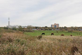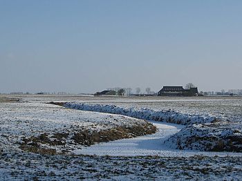Links: tussen de Paddepoelsterweg en de wierden van Enens; de sloot op de foto ligt in het verlengde van de laagte ten zuiden van Enens.