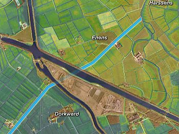 Linksonder zien we de grondberging langs het Van Starkenborghkanaal, rechts veehouderij Zwakenberg en links daarvan boerderij ‘De Paddepoel’ en de wierde Enens.