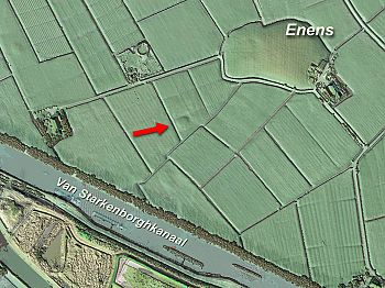 In een perceel groenland tussen de wierde Enens en het Van Starkenborghkanaal, vlak bij de plaats waar de vorige foto is genomen, bevindt zich in het veld nog een ander opmerkelijk spoor: een vierkant bultje omringd door een carré van slootsporen. Het geheel is ongeveer ¼ ha groot. Archeologisch onderzoek heeft hier nog niet plaatsgevonden.