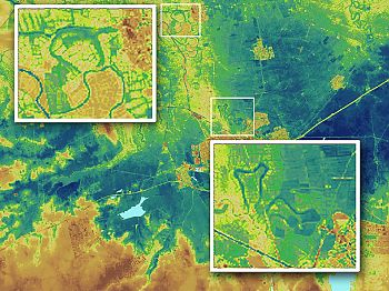 De lineaire sporen die we zojuist zagen corresponderen met het reliëf in dit gebied.