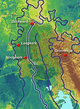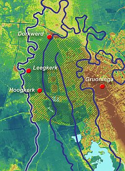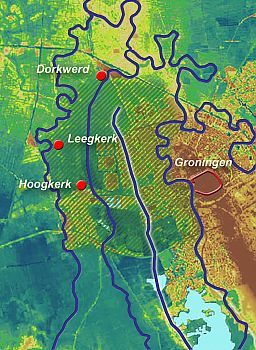 De veronderstelde oude loop van natuurlijke watergangen is op dit kaartje aangegeven met blauwe streepjeslijnen. In het vorige hoofdstuk heb ik al opgemerkt dat het opvallend rechte stukje streepjeslijn tussen Kleiwerd en Dorkwerd wel eens een kunstmatige watergang zou kunnen zijn die een verbinding heeft gevormd tussen de Hunsinge en de Hunze in de Paddepoel. Of is het in oorsprong wél een natuurlijke bedding geweest en is deze omstreeks 1200 ten behoeve van het vervoer over water gekanaliseerd en daarbij rechtgetrokken?