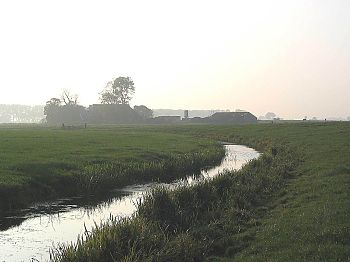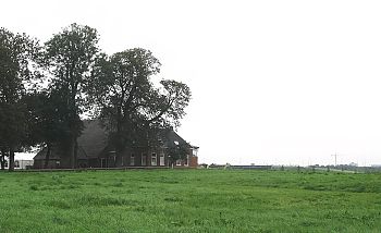 De boerderij op dit plaatje is ‘De Paddepoel’, gelegen naast de wierde Enens, in dat deel van de Paddepoel dat ten noorden van het Van Starkenborghkanaal ligt. Boerderij en wierde zagen we al eerder. De kromme watergang op de foto is het overblijfsel van een bedding die mogelijk bij het Eelderdiep heeft gehoord en later – in de dertiende eeuw – het water van de Drentse A afvoerde. Enkele tientallen meters ten noorden van deze plaats kwam deze bedding in de Hunze uit. Die plek – de Mude – hebben we de vorige keer besproken.