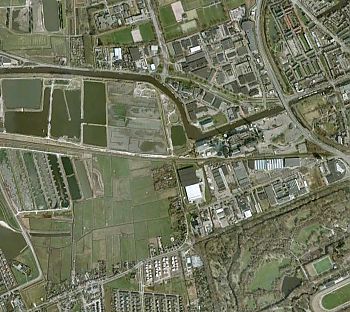 Het Hoendiep vertoont tussen de stad Groningen en Hoogkerk drie knikken. De eerste – de meest oostelijke – bevindt zich daar waar nu de Friesestraatweg begint. Even boven het midden van dit plaatje zien we bij het terrein van de voormalige Suikerfabriek ‘de tweede knik’ in het Hoendiep. Misschien is deze tweede knik – de plaats waar op 6 november 1907 de familie Van Panhuys verongelukte – een overblijfsel van een natuurlijke watergang. We kunnen dan denken aan de Woldsloot of zijn voorganger.