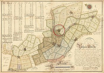 De cirkel markeert de plaats van de huidige boerderij Arbere. In de voormalige geulbedding liggen kleine percelen: de ‘Reilantjes’.