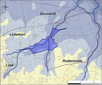 steeds in noordelijke richting heeft gelopen. Vanaf de plaats waar zich nu de noordoostelijke kop van het Zultemeer of Leekstermeer bevindt (de ‘Rietboor’), heeft een natuurlijke watergang in noordoostelijke richting – ongeveer langs de oude provinciegrens tussen Groningen en Drenthe – naar de Hunsinge gestroomd. Het tracé van dit stroompje correspondeert met een smeltwaterdal in de pleistocene ondergrond. Door afzetting van zeeklei en inversie moet aan het functioneren van deze watergang een einde zijn gekomen. Mogelijk is dat de oorzaak geweest van het ontstaan van het Zultemeer of Leekstermeer. Later zal het water uit de buurt van Roderwolde via dit meer (door mensenhand geholpen?) langs de oostgrens van Lagemeeden (de Zuidwending) noordwaarts en via de Nutwegstertocht in westelijke richting, naar de Woldgeul, zijn geleid. Op dit thema zal ik later terugkomen.13