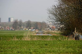 Rechts: de sloot aan de noordzijde is ooit veel breder geweest; op de voorgrond het riet langs de Lindt, die de oudere watergang op dit punt kruist.
