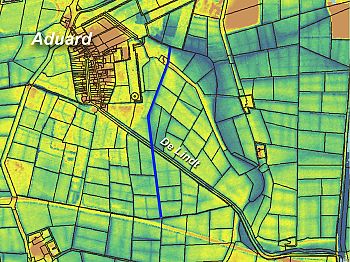 Voor de goede orde wijs ik nog even op een zwak punt in mijn hypothese over de waterloop tussen de Lindt en het parallel-kanaal ten noorden van Aduard. De kadastrale minuut vertoont geen duidelijke sporen die zouden kunnen wijzen op een aansluiting tussen de ‘verzakte sloot’ ten oosten van Aduard en het ‘parallel-kanaal’ ten noorden van het dorp. Alleen de hoogtekaart laat op een tot nu toe open gebleven perceel een vaag spoor zien dat van een verdwenen watergang zou kunnen zijn. Deze loopt schuin door het perceel op een manier die niet samenhangt met de vorm van dit stuk land, maar wel past bij mijn hypothese. Het bedoelde spoor is op het kaartje op de vorige bladzijde al enigszins zichtbaar, maar kan ik duidelijker laten zien met behulp van de nieuwe AHN-2.