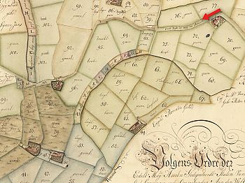 Het rode pijltje staat in een c. 1,8 ha groot perceel groenland dat door twee sloten in drie delen lijkt te zijn verdeeld. In werkelijkheid bevinden zich hier geen sloten en zien we op de hoogtekaart alleen de sporen van sloten die hier ooit hebben gelopen. Ook op de kadastrale minuut uit het begin van de negentiende eeuw (waarop dit perceel als bouwland staat vermeld) ontbreken de sloten al.