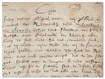 We beginnen met het document waarvan men steeds heeft gedacht dat het de oudste schriftelijke bron is over de waterstaatkundige ontwikkeling ten westen van de Hondsrug.2 Zoals gezegd is het origineel ervan niet bewaard gebleven, zodat we het moeten doen met een later afschrift. De in de tekst vermelde datum is ‘zaterdag na Sint Marcus 1313’ (18 april 1313), maar er zijn redenen om aan de betrouwbaarheid van die datering te twijfelen. In Een kronkelend verhaal vond ik een bespreking daarvan niet op zijn plaats en heb ik in mijn exposé de datering ‘omstreeks 1340’ gehanteerd.3 Wat mij betreft is het dispuut nog altijd