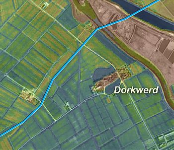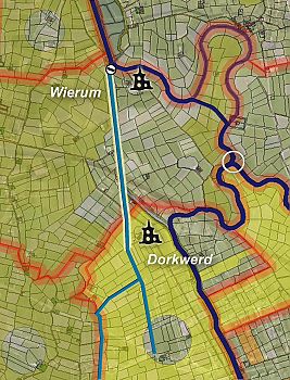 Het rare puntje in de kerspelgrens tussen Wierum en Dorkwerd ten noordwesten van de wierde van Dorkwerd herinnert aan de twee watergangen die hier – in verschillende perioden – hebben gekruist.