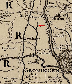 Het gebied tussen het Aduarderdiep en het Reitdiep is op de Coenderskaart niet erg accuraat weergegeven.48 Maar de oude loop van het Brundekemaar, die ook het water van Dorkwerd in zuidelijke richting afvoerde, staat er wel op (zie het pijltje). Ook de latere zijtak, die het Dorkwerder water ten zuiden van het huidige Nieuwklap in het Aduarderdiep bracht, is ingetekend. Ten noorden van Hoogkerk is het Kliefdiep, dat voordien het water van het Brundekemaar naar de Hunsinge of Aduarderdiep afvoerde, abusievelijk aangegeven alsof het een weg was.