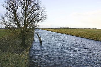 De plaats waar de Jonge-Heldtocht (eerder Brundekemaar geheten) in het Aduarderdiep (voorgrond) uitkomt