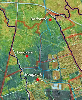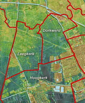 De hoogtekaart – de rode lijnen geven de kerspelgrenzen aan – laat zien dat het dorpsgebied van Dorkwerd naar het zuiden afhelt. Nadat het veen van Lieuwerderwolde (de finke) was verdwenen, liep het Dorkwerder water vanzelf die kant op.