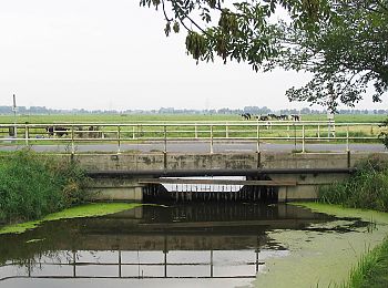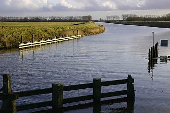 We kijken in noordelijke richting. Het gemaal bij de Dorkwerder sluis is te zien.