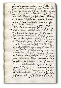 ‘Syabbo, abt van het klooster in Adewerth, Outgherus, abt van het klooster in Zelewerth, met hunne kloosterlingen, benevens de overheden van Groningen en Hunsgonia verklaren dat de inwoners van Tammingheland, Liuwerderwolde en van de Suithoen en Northoen eene overeenkomst hebben getroffen betreffende punten van dijkrecht.