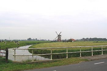 De foto is genomen aan de zuidzijde van de Friesestraatweg. We kijken in westelijke richting. De molen in het midden is ‘de Jonge Held’.
