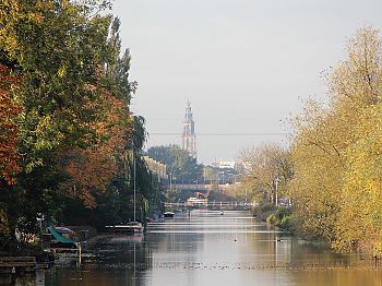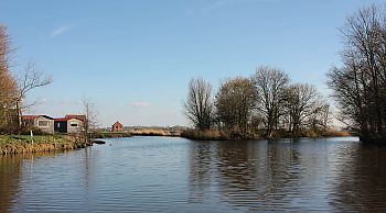 Links de monding van het het Lustigemaar (met camping en kanoverhuurbedrijf ‘De Banjer’), rechts het Damsterdiep. In de verte is het torentje van Woltersum zichtbaar.