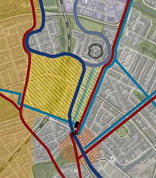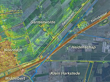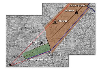 Het tracé tussen de oude Hunzebedding en de Borg bij Ruischerbrug – de Borg is op het bovenstaande kaartje aangegeven met een zwart lijntje – volgt de perceleringsstructuur van het zuidelijke deel van Noorddijk (het groene gebied op het kaartje), het stuk tussen de Borg en (Ooster)Dijkshorn past in de kavelstructuur van het Vierendeel (het bruine gebied).