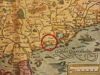 We zien Noordwest-Europa op zijn kop. In de cirkel ligt Groningerland. Links van de stad Groningen het Damsterdiep, rechts van de stad het Reitdiep.