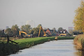 In de ‘oksel’ tussen het Eemskanaal en de Borgsloot werd in de herfst van 2013 druk gegraven. Op de achtergrond zien we de huizen aan de Harkstederweg te Ruischerbrug. Die weg liep naar de oude Draaibrug nr. 3 over het Eemskanaal, die even ten oosten van de huidige Borgbrug lag.