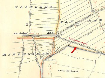 Het pijltje wijst naar een gérend stukje land ten zuiden van het Slochterdiep dat bij het kerspel Heidenschap behoort.
