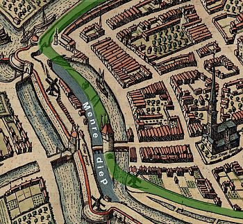 Bewerkte uitsnede van de stadsplattegrond van Braun en Hogenberg uit 1575. De weergegeven situatie is die van de late zestiende eeuw.