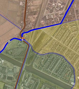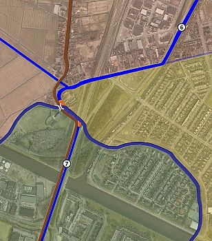 - De schuitevaarders maakten gebruik van een stukje Hunzebedding, maar moesten wel twee overtochten of overtomen ‘nemen’. Deze zijn op het plaatje aangegeven met oranje blokjes.