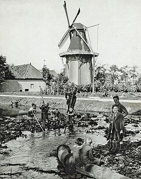 Aan de Molenstreek in Noorderhoogebrug spelen kinderen in de modder tijdens het dempen van het Boterdiep.