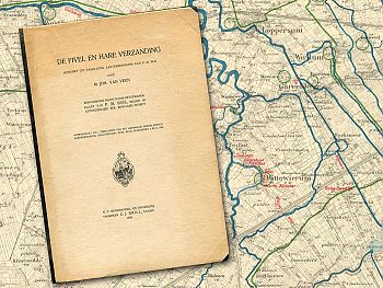 Nog meer dan aan de foto’s is dat te zien aan de kaart die bij ‘De Fivel en hare verzanding’ hoort. Op een topografische kaart zijn de waterlopen, dijken en zijlen ingetekend zoals Bos die op basis van zijn waarnemingen in het veld had gereconstrueerd.