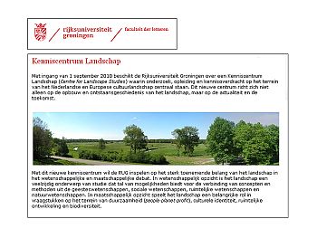 Aan de Rijksuniversiteit Groningen bestaat sinds enige jaren zelfs een nieuw kenniscentrum, dat wordt geleid door prof.dr.ir. Theo Spek. Het nieuwe instituut wil de plek zijn waar kennis van allerlei herkomst wordt gebundeld en geïntegreerd. Dat is nodig om op een eigentijdse manier aan landschapsonderzoek te doen. De materie is zo divers en de studie ervan stelt zo uiteenlopende eisen, dat ze voor een enkel individu nauwelijks meer te behappen is.