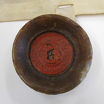 Het zegel van graaf Edzard is gevat in een soort schotel. Bij Nederlandse zegels zien we zelden, maar bij Duitse heren was het de gewoonte om het kwetsbare zegel op deze manier te beschermen.