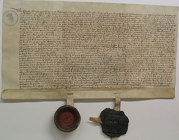 To orkonde hebben wij Edzard, grave vors., voer ons ende onsen vrentlicken lieven broder dessen brieff mit onsen anhanghende inghesel, ende wij borgemester ende raed vors. voer ons ende van onss ghemene stad weghen mit onss stad anhangende inghesegel witliken laten verseghelen ende verseghelt.