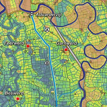 Tussen boerderij Langeveld (even ten zuiden van het afgebeelde gebied) en de flauwe bocht bij Bolshuizen (B) doorsnijdt het diep de verkaveling en vormt het de kerspelgrens tussen Feerwerd en Garnwerd.