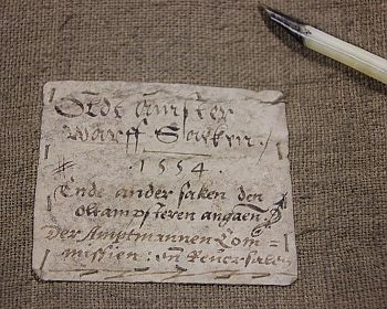 Het perkamenten etiket, met een door secretaris Alting geschreven opschrift, is met ruwe steken vastgezet.