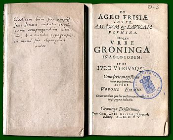 Ubbo Emmius had een uitstekende relatie met het stadsbestuur. Dat blijkt onder meer uit deze opdracht in zijn boekje ‘De agro Frisiae’ uit 1605 (GrA T1765-3).