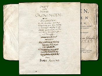Daarna zette hij zich aan het schrijven: De Pilaren en Peerlen van Groningen (1648) en ‘Oudt en Nieu Groningen’. Dit laatste – een vergelijking tussen het middeleeuwse Groningen en dat van het begin van de 17e eeuw – is in het manuscript-stadium blijven steken. Het eindigt in de zomer van 1648, toen stadhouder Willem II in Groningen was om het conflict met het Oldambt te beslechten (GrA T835-293.1). Bij het schrijven van deze teksten kon Bernard Alting gebruik maken van de unieke kennis die hij als syndicus had opgedaan over de geschiedenis van Stad en Lande.