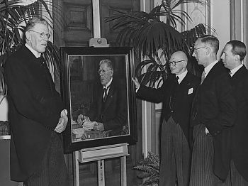 Van links naar rechts zien wedr. H.P. Coster, prof.dr. J. Lindeboom (hoogleraar in de kerk- en dogmengeschiedenis te Groningen), rijksarchivaris dr. W.J. Formsma en aantredend gemeentearchivaris dr. A.T. Schuitema Meijer.