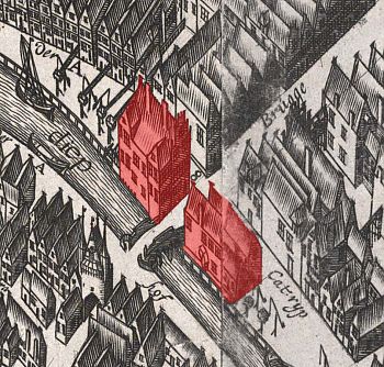 Er is te weinig informatie om deze jongere gegevens op een sluitende manier in verbinding te brengen met hetgeen we uit de akte van 1263 weten. Ook de vogelvluchtplattegronden van Braun en Hogenberg (c. 1575) en Egbert Haubois (c. 1635) helpen ons daarbij niet. De situatie die we daar zien is vermoedelijk veel later, in de vijftiende en zestiende eeuw, ontstaan. Bij Haubois zien we aan de noordkant van de Brugstraat een groot pand rechtstreeks uit het water oprijzen. De gotische hoofdgevel van dit huis staat aan de straatkant en wel op enkele meters afstand ten oosten van de brug. Het deel van de zuidgevel tussen de hoofdgevel en het water lijkt de zijkant te zijn van een aanbouw waarvan de daklijn haaks staat op die van het hoofdgebouw. Dezelfde situatie zien we aan de noordkant van hetzelfde pand. Zou deze opmerkelijke lay-out van het gebouw kunnen zijn ontstaan doordat het oorspronkelijke pand in westelijke richting is uitgebreid door het bebouwen van een aangrenzende strook grond? De plattegrond van Braun en Hogenberg doet hetzelfde vermoeden, maar weerspiegelt een vroeger stadium van de ontwikkeling. Ook hier zien we het oorspronkelijke pand op enige afstand van de rivier staan, met tussen het water en het hoofdpand een soort overkluisde gang. Er zijn geen schriftelijke bronnen bewaard gebleven die ons duidelijk maken wat hier is gebeurd. Wel is er, op een andere plek aan het Hoge der A, sprake van een vergelijkbare situatie. De ontwikkeling die zich daar heeft voorgedaan is wat beter gedocumenteerd en kan ons wellicht helpen bij het verklaren van de situatie aan de Brugstraat. Ik kom daarop in het vervolg terug.