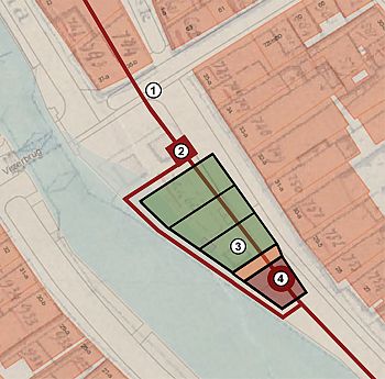 - Ten noorden van de huizen die ook op de plattegrond van Braun en Hogenberg staan afgebeeld liggen enkele kleine bouwsels. In de legger van stadsinkomsten van 1584 worden ze vermeld als (rechts) een ‘tassche’ aan de Kassentoren en (links) en ‘boe’ (schuur) tussen de ‘tassche’ en de Kranepoort.