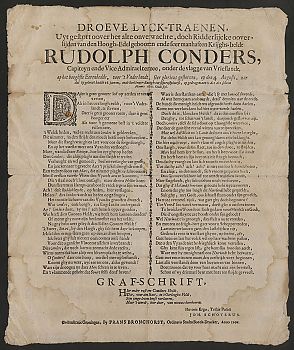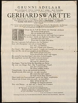 Hoe zag zo’n lijkdicht er eigenlijk uit? Als we een aantal onder de loep nemen vallen verschillende dingen op. Het gedicht op het overlijden van Gerhard Swartte in 1665 illustreert bijvoorbeeld hoe lang de titels konden zijn, die groots boven de gedichten pronkten van de losse gedrukte vellen (planodrukken):