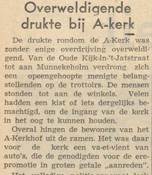 Het weer is niet zo fantastisch, want als Juliana en Bernhard om vijf over drie bij de A-kerk aankomen regent het. Ook hier is het aantal toeschouwers ‘overweldigend’. Het hele trottoir tussen de Oude Kijk in ’t Jatstraat en het Munnekeholm staat vol met een ‘opeengehoopte menigte’.