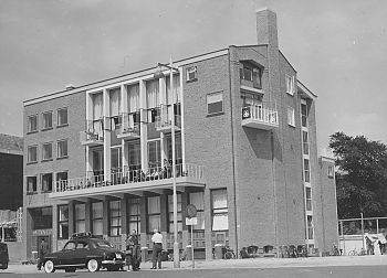 De eerste steen van het door de Leeuwarder architect J.J.M. Vegter ontworpen pand, wordt gelegd door het oudste erelid prof.mr. I.B. Cohen.